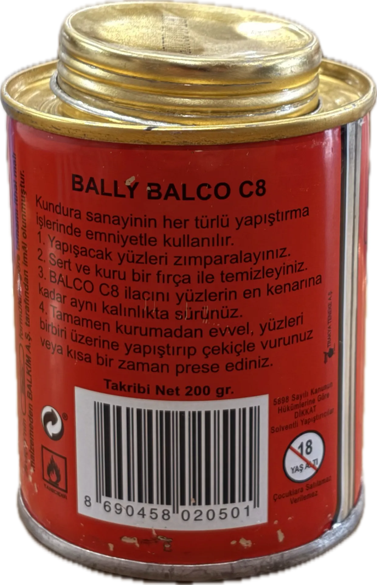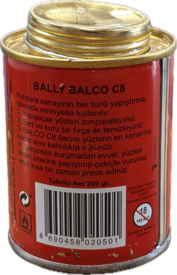 Bally C8 200 Gr, döşeme, ayakkabıcılık, mobilya, oto döşeme ve tamirat işlerinde kullanılan yüksek performanslı bir solvent bazlı yapıştırıcıdır.