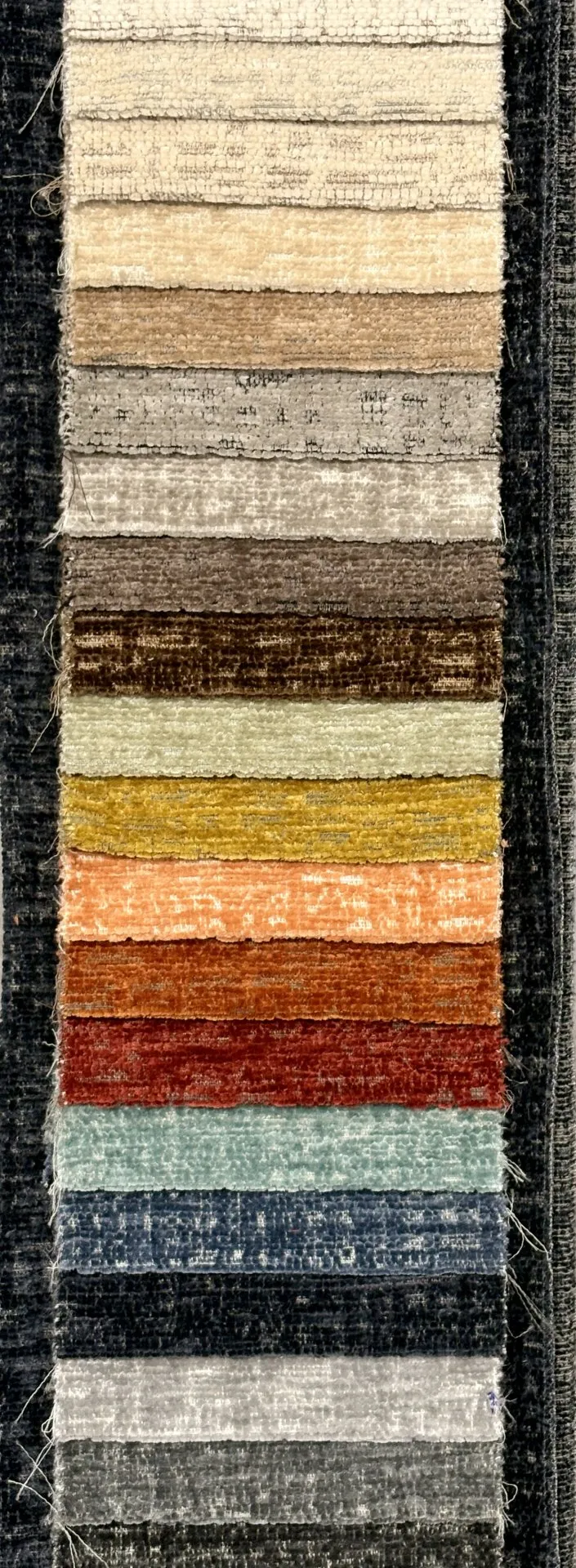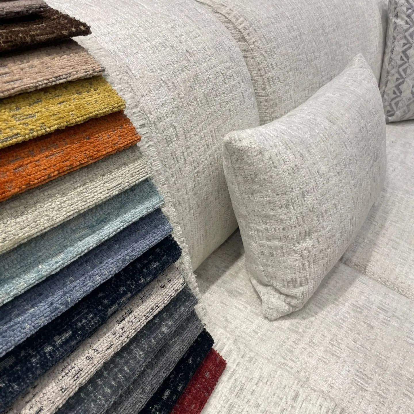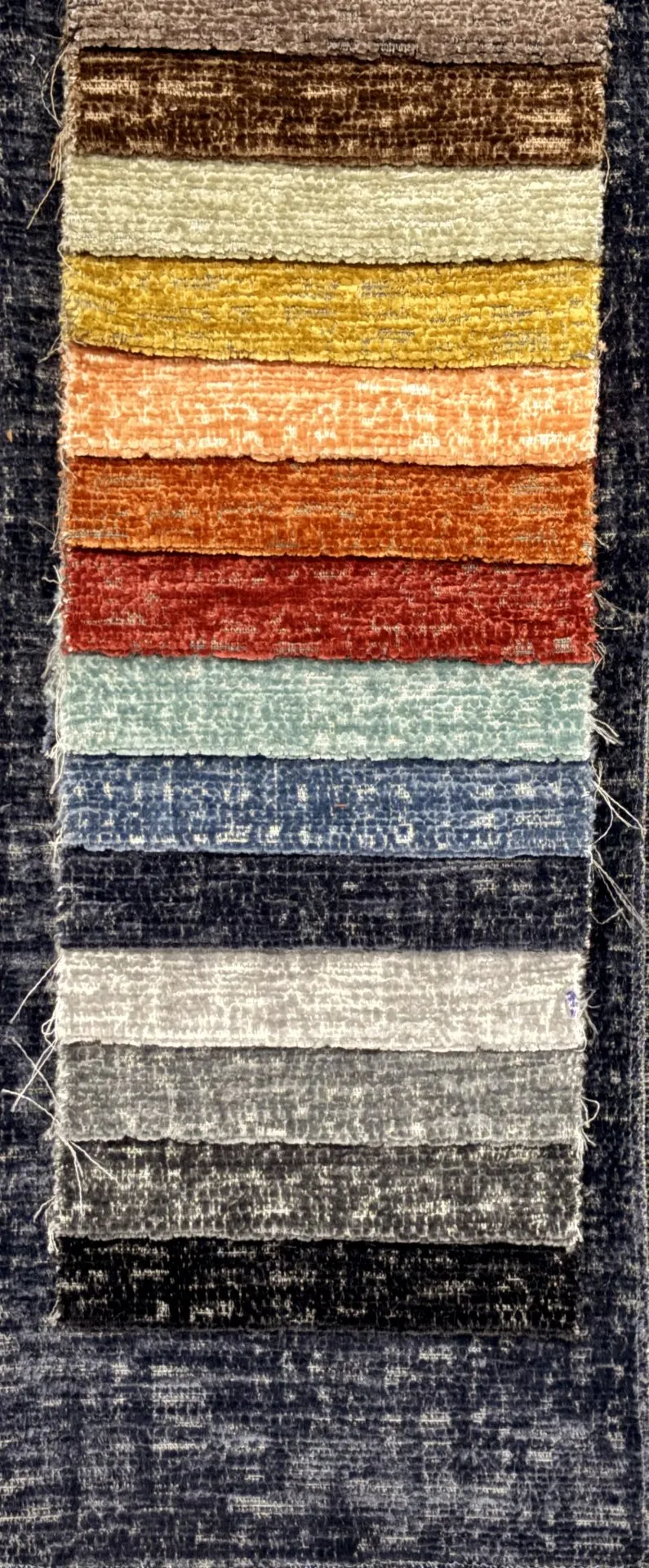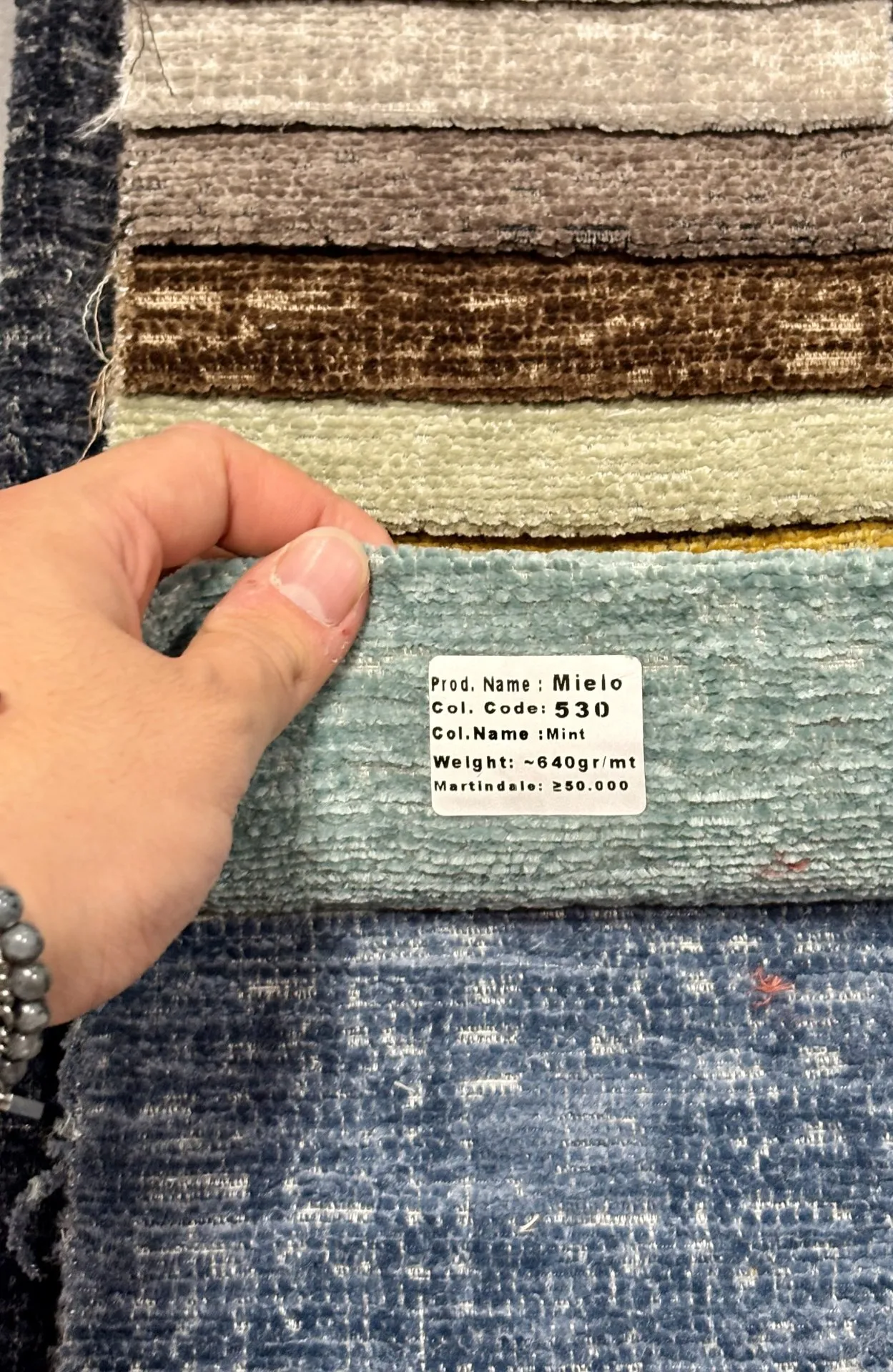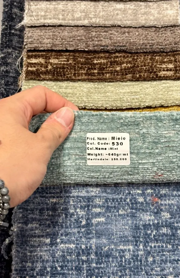 MİELO döşemelik kumaş, yaklaşık 640gr/m² ağırlığı ve 250.000 Martindale aşınma dayanımıyla yüksek performans gerektiren tüm mobilya uygulamalarına uygun bir seridir. Tok tutuşu, hacimli dokusu ve modern renk seçenekleri sayesinde koltuk, berjer, sandalye, baza başlığı gibi ürünlerde hem şık hem dayanıklı bir kullanım sunar.