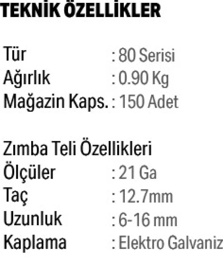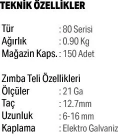 NAİL 80/16, 80 serisi 6–16 mm zımba uyumu ve güçlü pnömatik mekanizmasıyla döşeme, kaplama ve genel montaj işlerinde kullanılan profesyonel bir zımba tabancasıdır. Hafif yapısı ve dayanıklı gövdesiyle uzun ömürlü performans sağlar.
