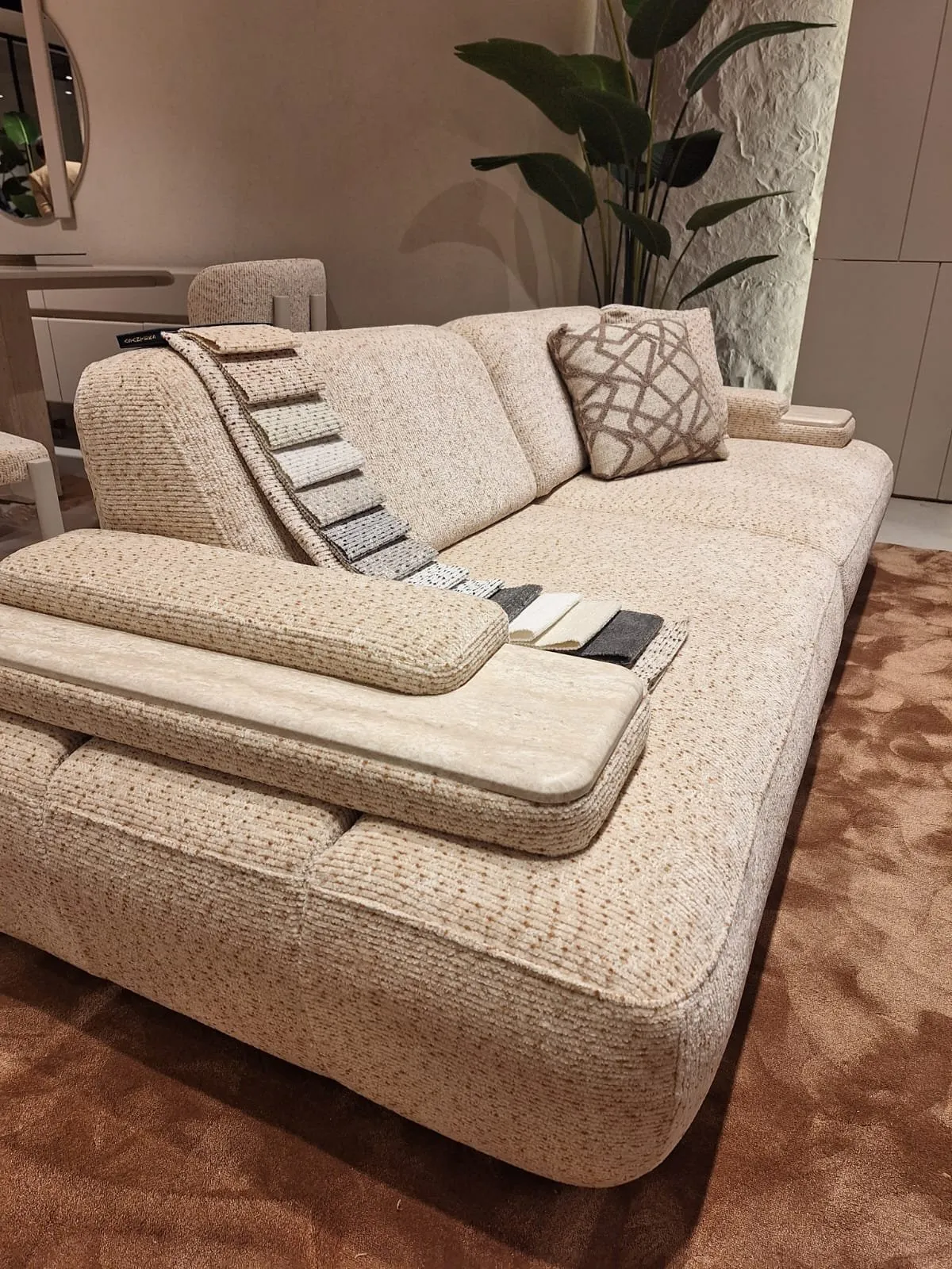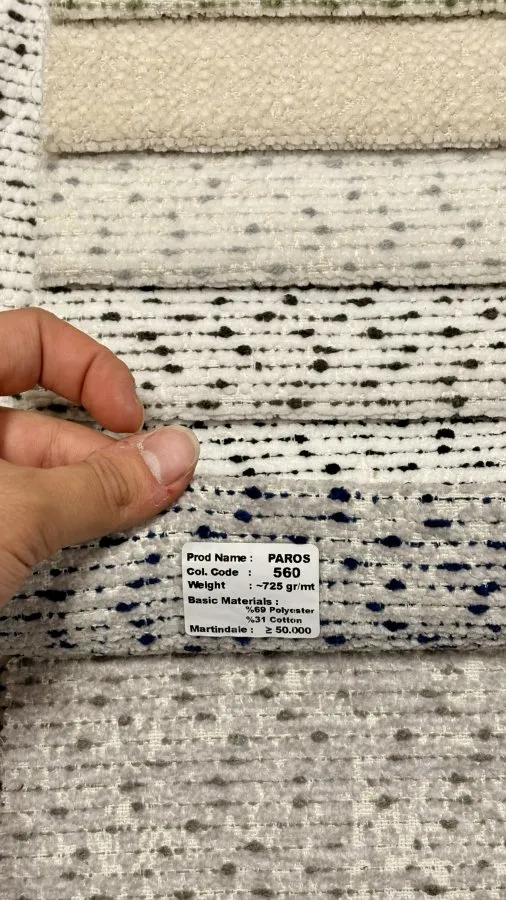 PAROS döşemelik kumaş, modern dokusu ve özel nokta efektli tasarımıyla hem konut hem de proje işlerinde şıklığı ve dayanıklılığı bir araya getirir.