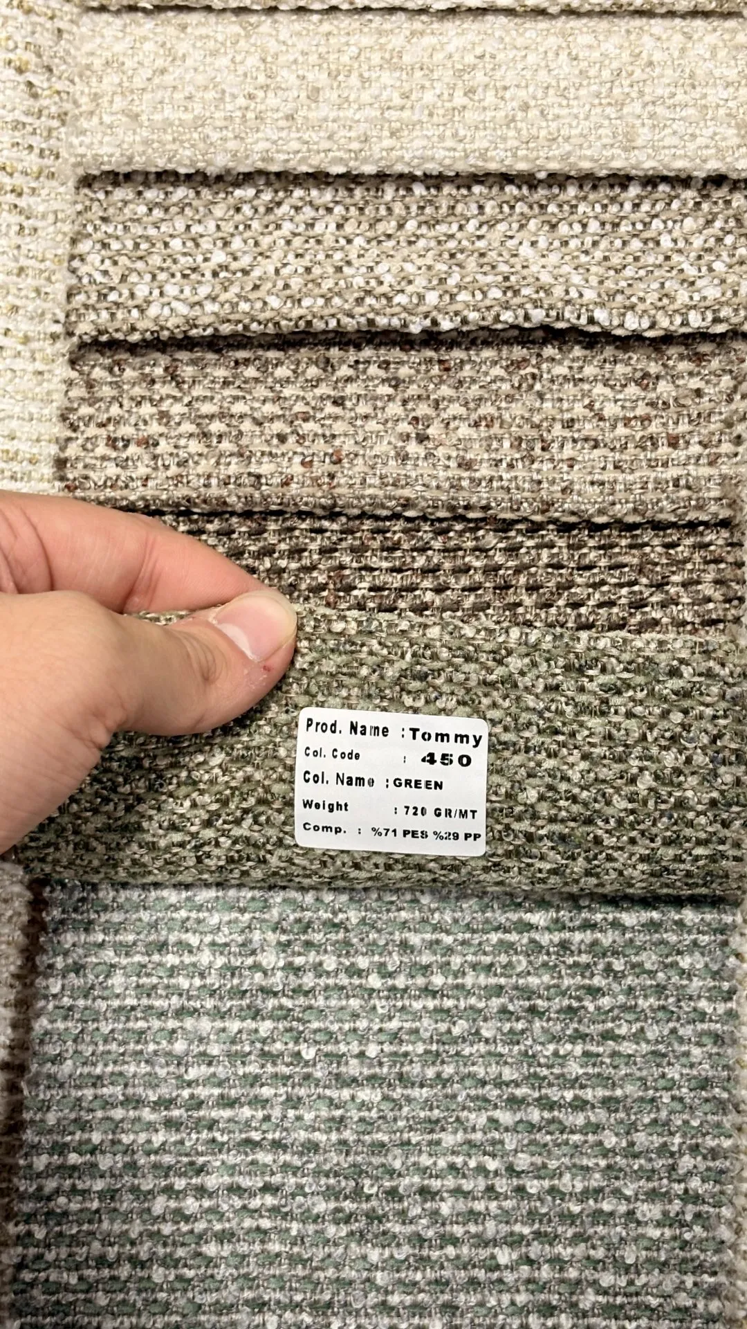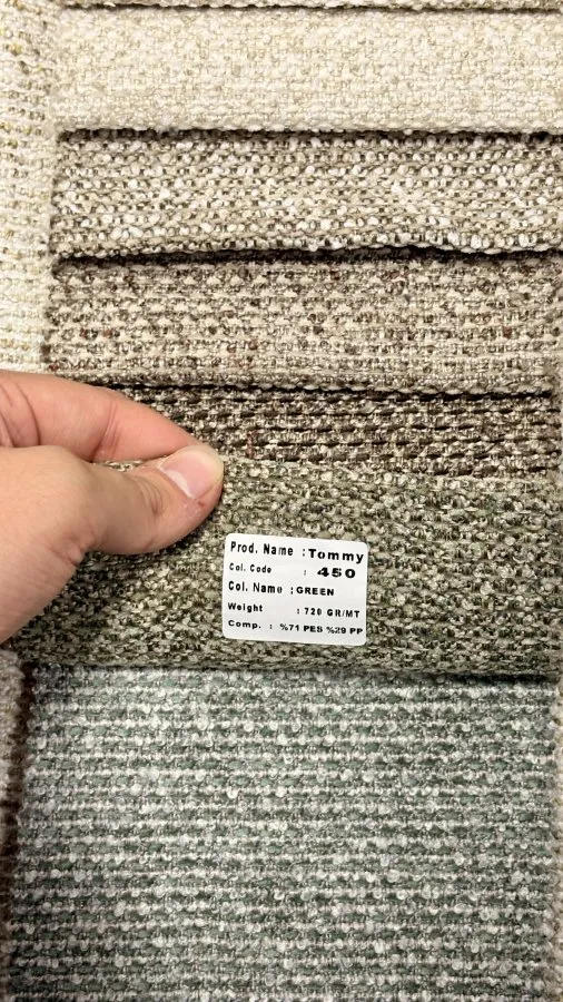 TOMMY döşemelik kumaş, %71 PES ve %29 PP karışımıyla üretilmiş, 720GR/m² ağır gramajlı, son derece dayanıklı bir premium döşemelik kumaştır. Sıkı dokusu, hacimli yapısı ve modern renk paletiyle hem ev hem ticari alanlarda uzun ömürlü kullanım sağlar.