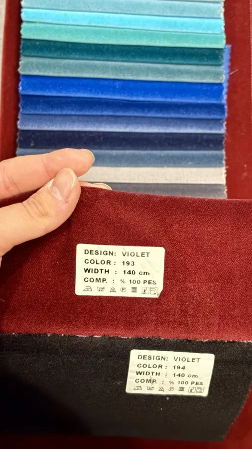 Violet Mat Kadife, yumuşak ve mat yüzey dokusuyla modern ve şık bir görünüm sunan döşemelik kadife kumaştır.